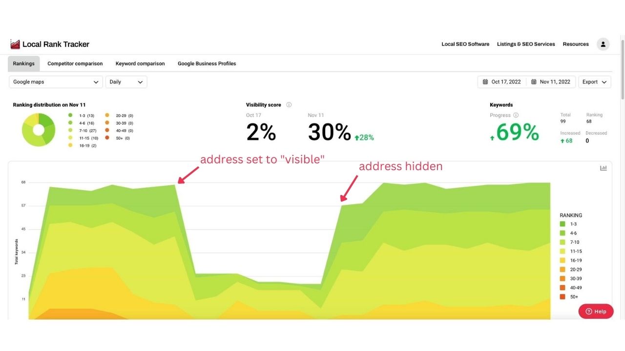 This example shows why you want to track your rankings in a tool like the Whitespark Local Rank TrackerAs soon as he hid his address, boom, all his rankings in those service areas popped back up.