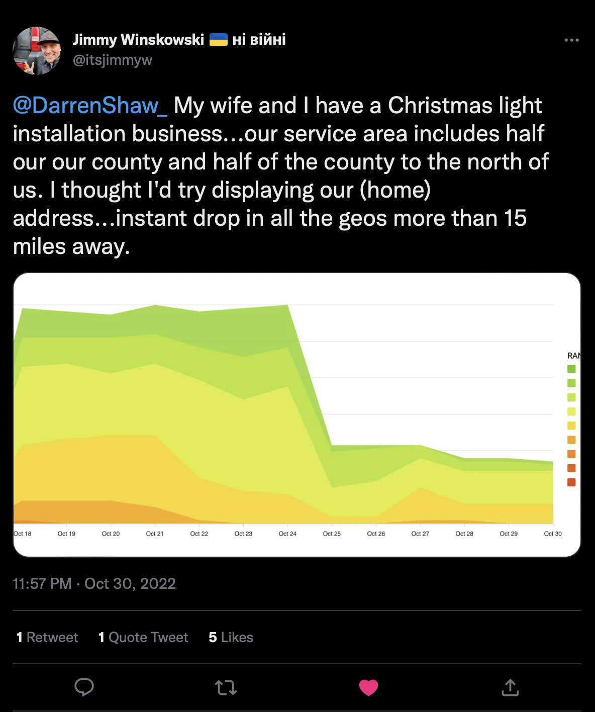 Would you like to track your rankings this easily? Try the Whitespark Local Rank Tracker!So, Jimmy sends me this tweet back on October 30th, and says that he and his wife have a Christmas light installation business: “Our service area includes half of our county and half of the county to the north of us. I thought I’d try displaying our home address. Instant drop in all the geos more than 15 miles away.”