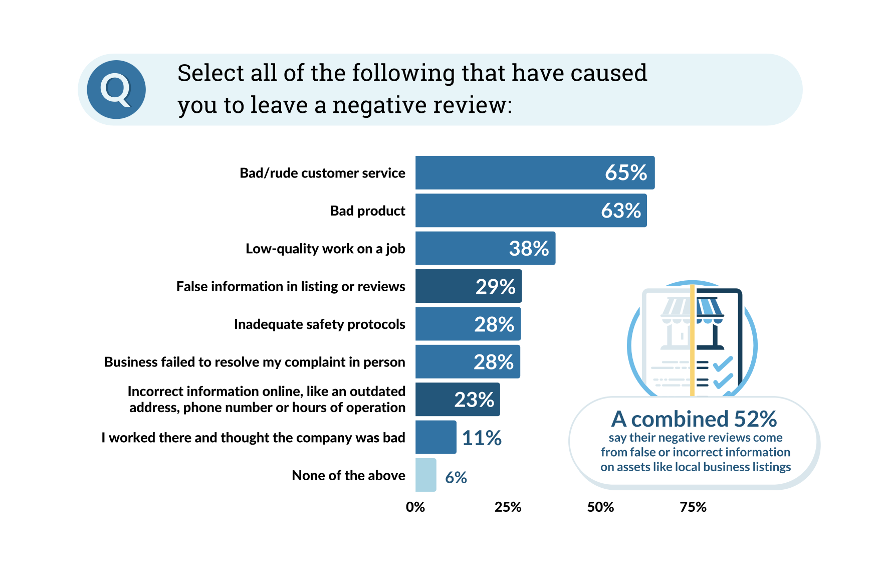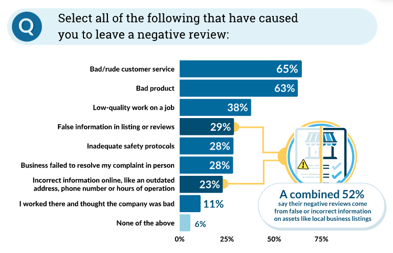 Related to this, Miriam Ellis at Moz recently published a great report, “The Impact of Local Business Reviews on Consumer Behavior,” and one of the things that really stood out to me in her article was that 52% of respondents say their negative reviews stem from false or incorrect information online.