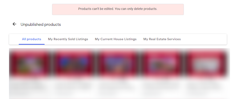 When you click View products, a red banner appears at the top of the page saying, “Products can’t be edited. You can only delete products.” If you try to edit a Product, all of the information fields are locked and you can only delete the Product.