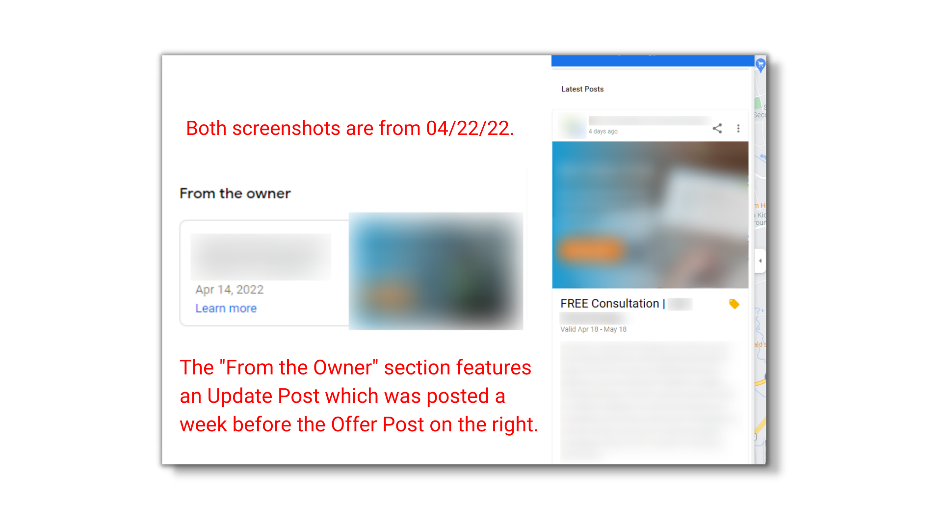 The “From the Owner” section of the business profile in Maps does not feature Offer Posts, even if it was the most recent Google Post.