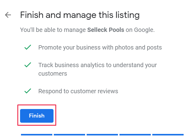 #8. You will be prompted to Finish and manage this listing via the verification process (likely via postcard). Click Finish