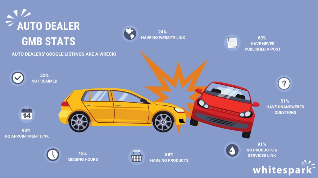 Hardly any auto dealers are taking advantage of the features in GMB. The results that are the most shocking are that of the dealer listings we analyzed: