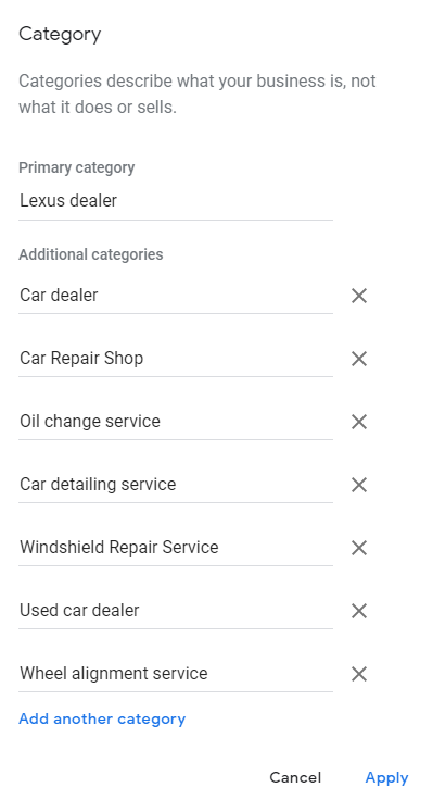 The primary category you select for your dealership is your number one rankings booster, so make sure you choose your most valuable search term.