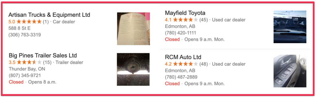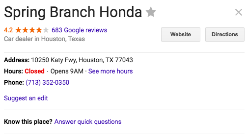 13% of the dealership listings we looked at didn’t have any hours listed. Missing or incorrect hours can negatively impact your rankings, and worse, people will be annoyed if they show up at your dealership when it’s not actually open.