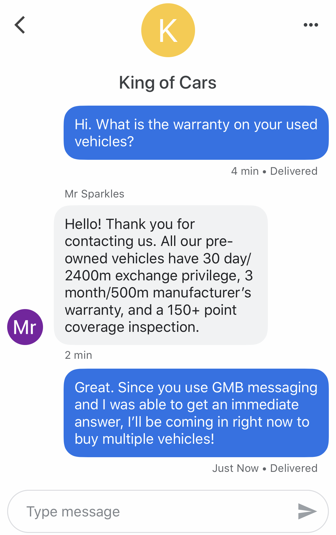 Want a hot lead right now? Make it easy for your potential customer to contact you. You can turn on messaging on your GMB listing and it opens a sort of live chat right through the Google Maps app. To use this feature, you need to run it through the Google My Business mobile app. I recommend adding your reception staff and sales staff as managers of your Google listing, and then their phones will show an alert any time a new message comes in. Instant messaging allows you to quickly handle sales and support questions, and be in the moment with your customer, which can help you close that deal.