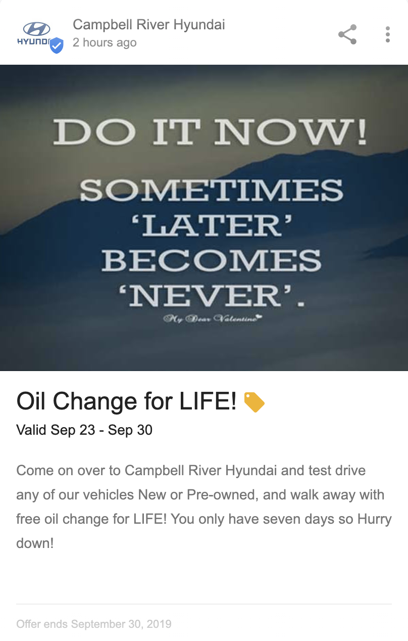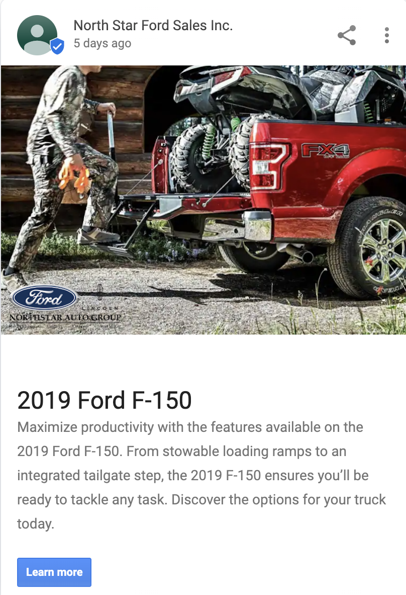 Promote anything at your dealership right on your listing by adding updates, events, and special offers. Posts get good exposure and visibility in search, and can convert directly into business. There are many different post types you can use and you can link them right to your sales pages.What’s New/Update Post