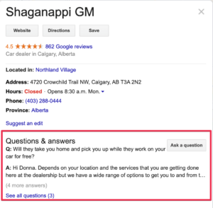 You can and should add your own questions to your Google listing, and also answer them. This will allow Google searchers to get instant answers to the most common questions that come up at your dealership. If you already have a Frequently Asked Questions section of your website, you can just add these same questions and answers right to your Google listing.