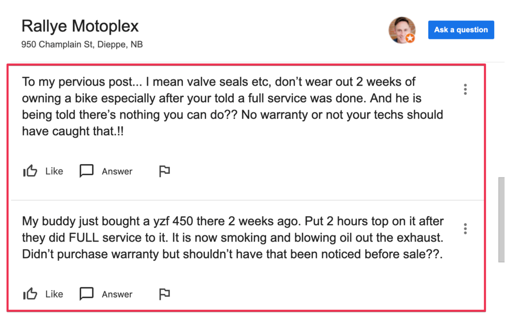 Pro tip: Sometimes negative reviews come in on Q&A. You can flag them, and Google will remove them because they are not questions and this section should not be used for reviews. Also, if the questions are not relevant to your business, you can report these for removal as well.