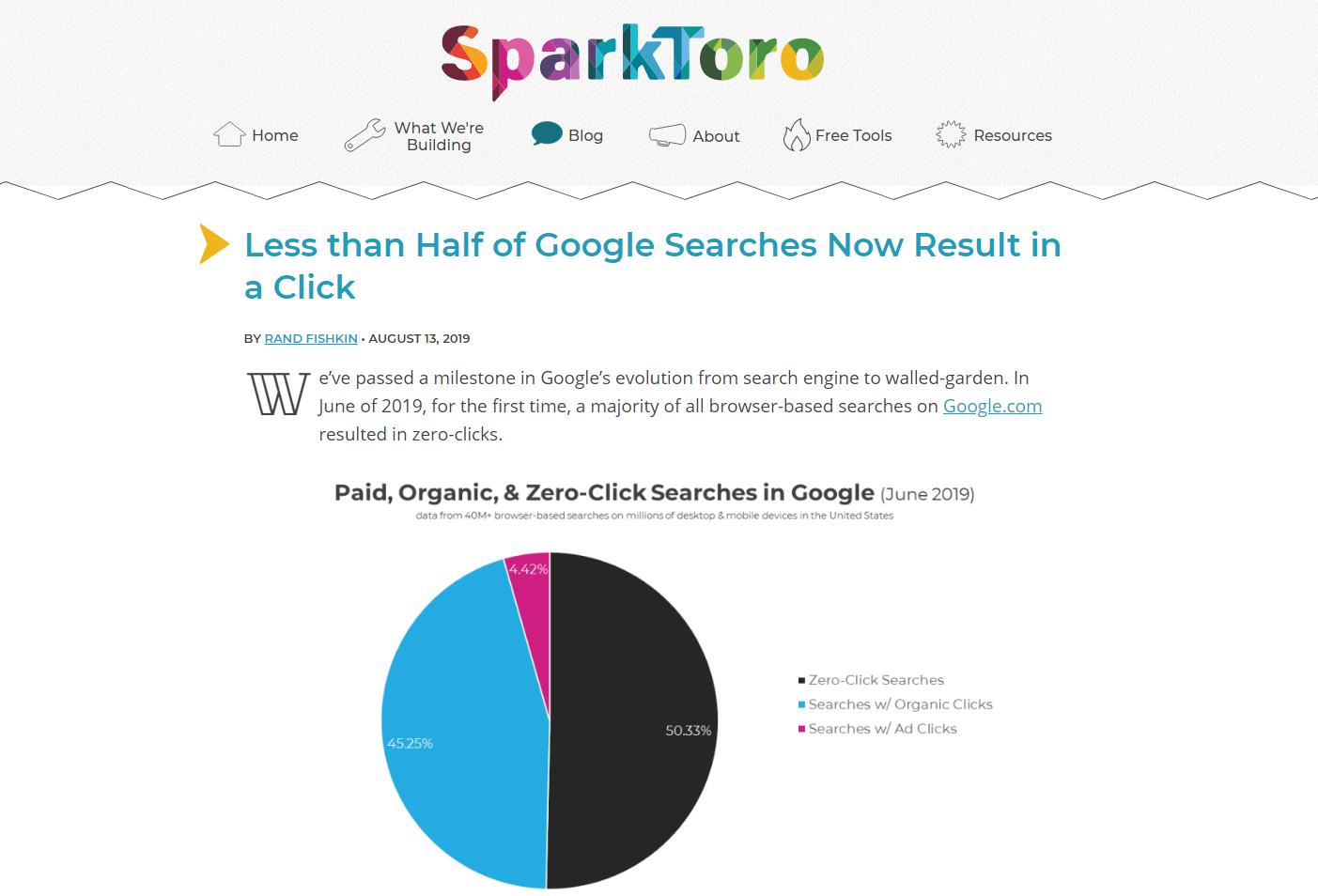 The first four spots get 88.7% of the clicks. research from Rand Fishkin and Mike Blumental has shown us that websites are getting less traffic than ever, because Google wants to keep searchers on Google.