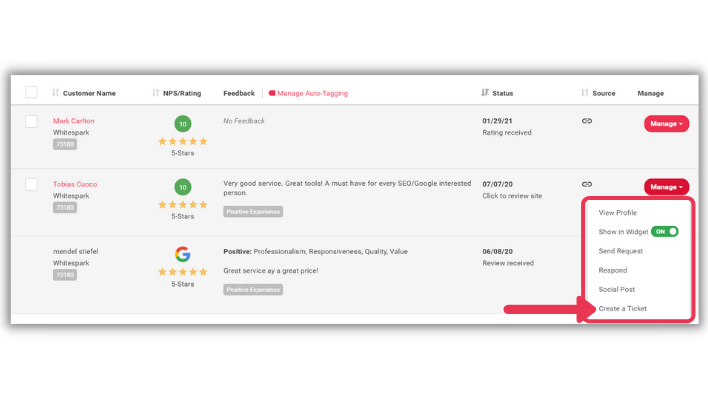Tickets allow you to reply to feedback within Reputation Builder. Users have the option to use a premade template or a user-specific premade signature, and can update the ticket status. Your reply will appear in your Review Widget to showcase your response to others visiting your website.