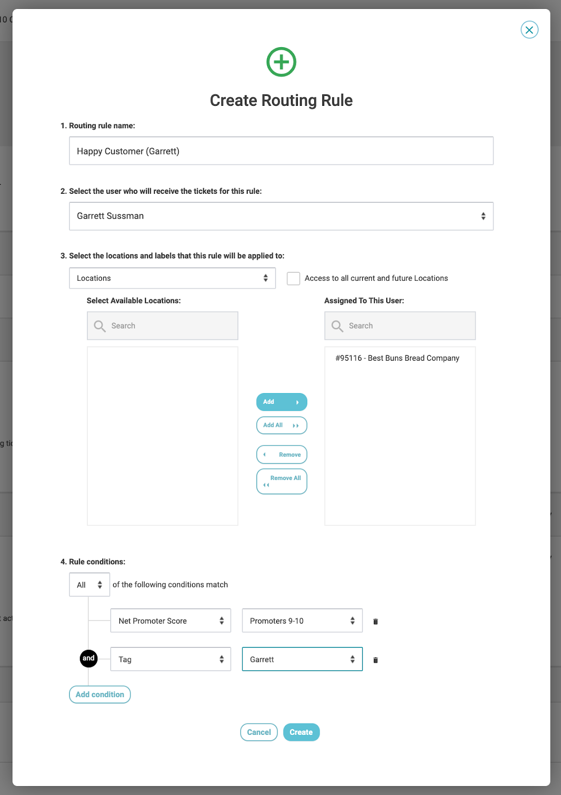 Your rules can be based on Net Promoter Score, Tags, or review ratings. You can add multiple conditions to each rule.Â