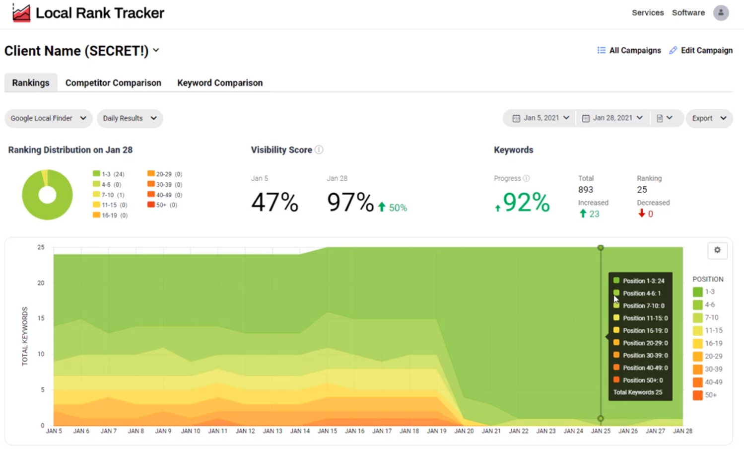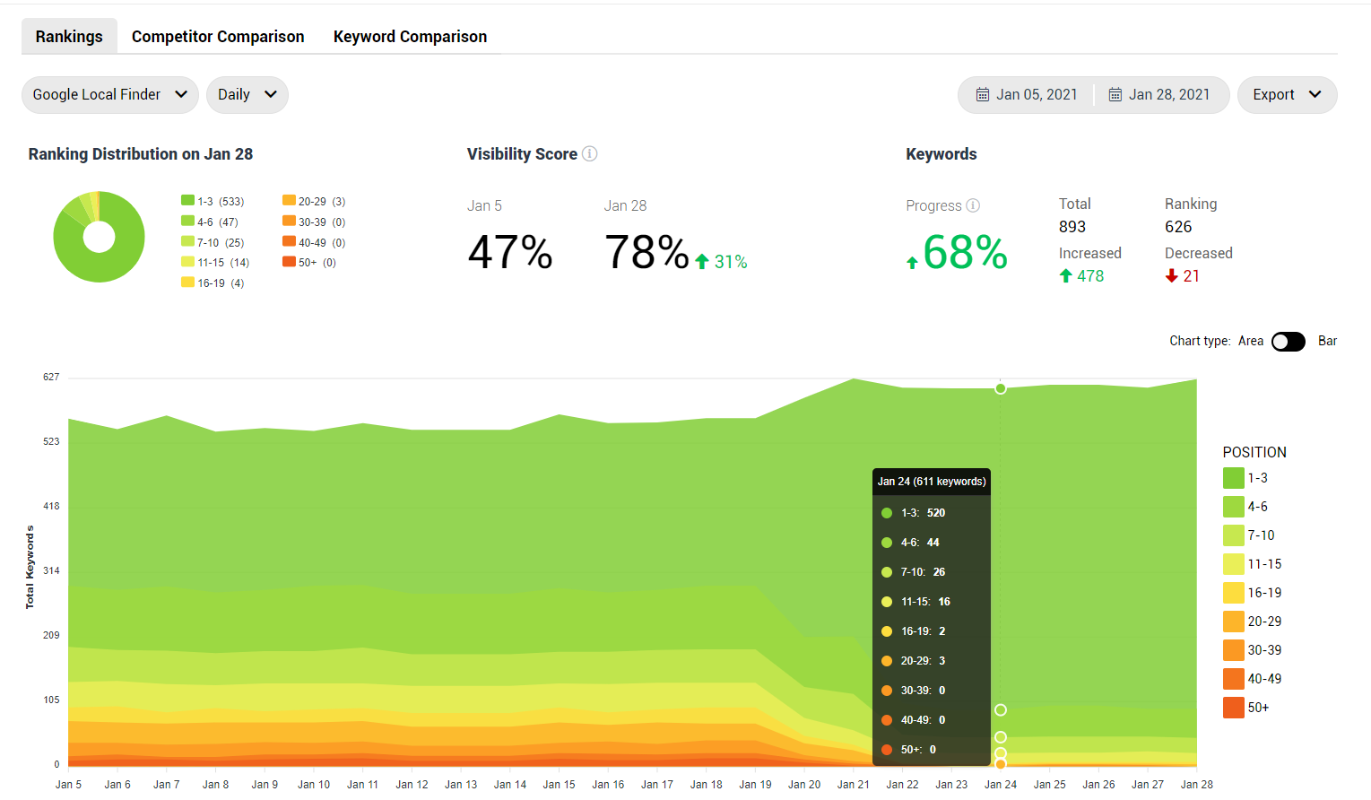 Let me show you what kind of impact this had for them. We are tracking about 24 locations. You can see that their visibility back on January 16th – they had about 274 keywords ranking in positions 1 to 3 and hitting the local pack on those. Look at the improvement after we made the change. Now they have 520 keywords ranking in positions 1 to 3. You can see a massive impact across all their locations and across all the different keywords that we’re tracking. That a 31% improvement across visibility score.