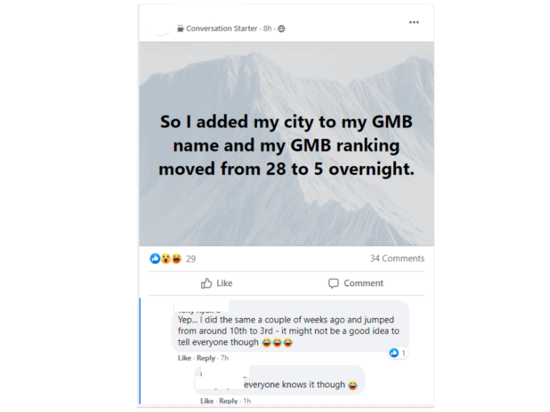 I see it in Facebook groups too. I see comments like this all the time, like this guy who says, “I added my city to my GMB name and my GMB ranking moved from position 28 to number 5, overnight,” and you know this jives with the case studies I just showed you.