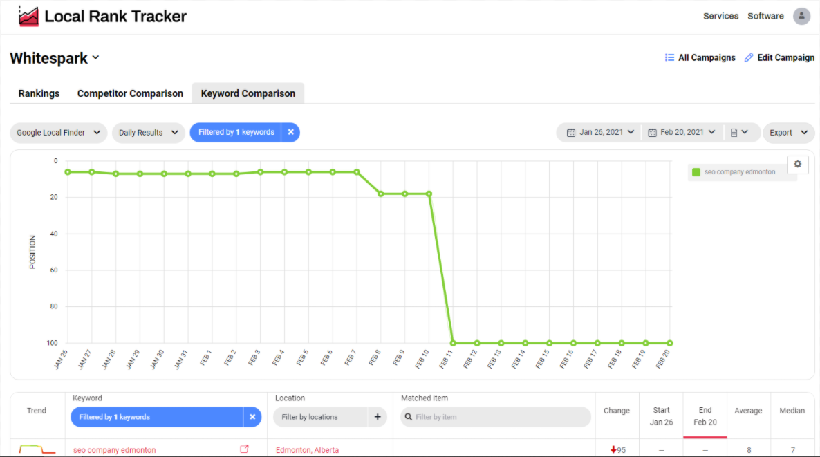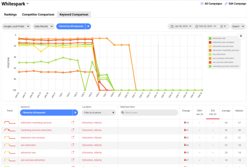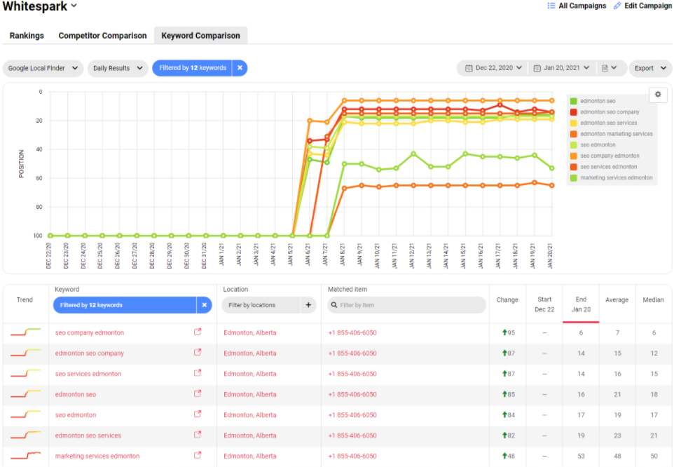 This is for a term that we did not rank for at all. And these results are from the Local Finder. Our local rankings jumped up 94 positions overnight. That’s pretty phenomenal, a pretty significant impact. And it wasn’t just that one term ‘SEO company Edmonton’ that increased ranking, all the other terms that we are tracking in Edmonton also went up too. If I filter the rankings by all the Edmonton terms – boom, look at this: