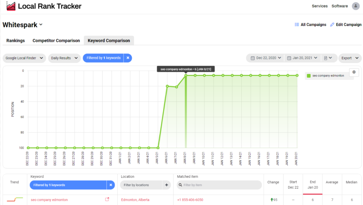 I added the keyword ‘SEO company Edmonton’ to the Whitespark listing. You can see here in Whitespark’s Local Rank Tracker on January 5, the keyword ‘SEO company Edmonton’ was added. Prior to this date, we didn’t rank at all for this term. The day after I added the keywords, we started ranking in position 20, and then two days later, we jumped up to position 6 and we stayed there.