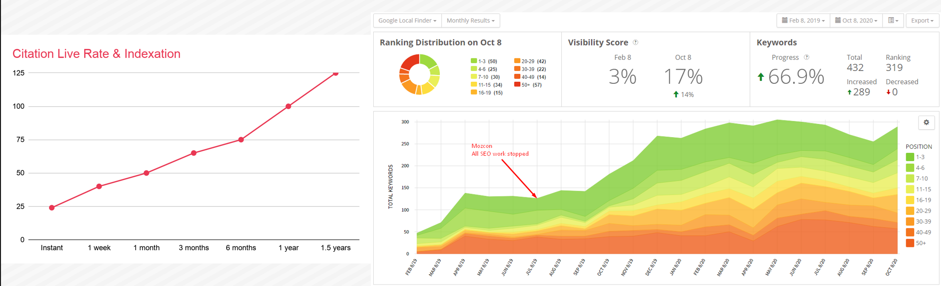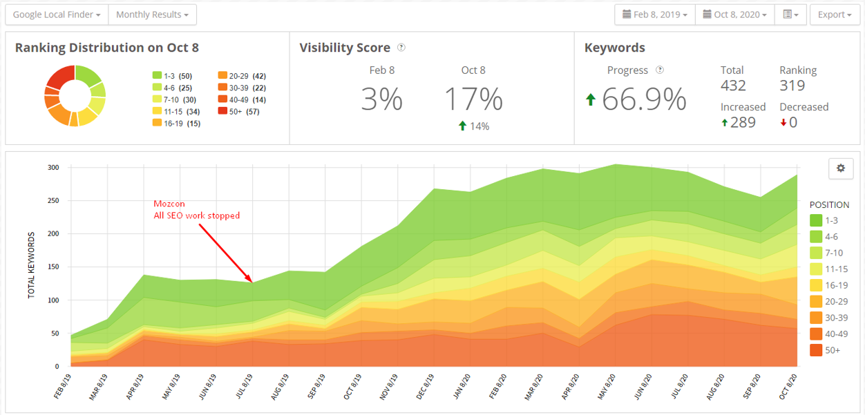 Look what happened. Oh my God, look at look at the rankings, they basically went from, you know, this point here, this where we stopped doing SEO work. This is where I presented a MozCon to like doubling or tripling the number of rankings they have now. It’s really awesome to see that impact, like what the heck?!