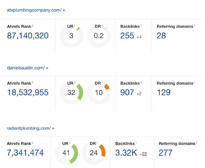 Plug those domains into your backlink checker tool and it will give you some sort of summary metric, such as page authority and domain authority for Moz, or URL rank and domain rank for Ahrefs. (Side note: I think the page level metrics usually matter more than the domain metrics for a page’s ranking ability.) You also might want to compare the number of backlinks and the number of referring domains. A lot of the time, tons of links will come from a single domain because it’s in a sidebar, or footer, etc. 5,000 links from the same site is obviously a lot different than a link from 5,000 different sites.