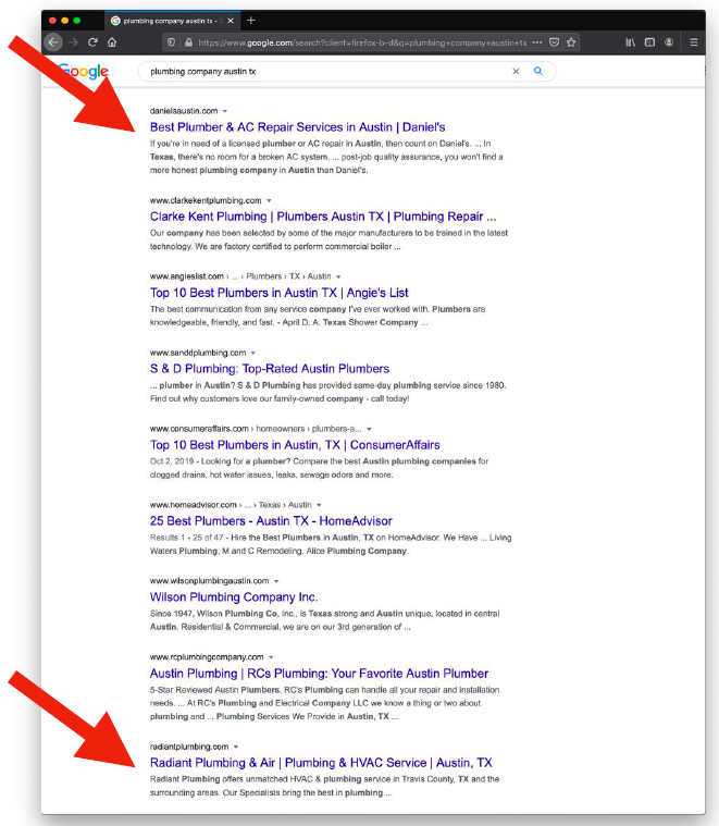 Whenever you’re searching, you’re really just looking to get a sense of whether they’re killing it or not killing it at all. Or maybe there’s something holding them back. When I search plumbing company Austin, TX. ATX is ranking at the top of the local pack for my search and they’re on page two of the organic results. To me, this indicates that the site is viable, doesn’t have any big deal breakers or impediments. In this case, maybe some content improvements, or link building are all it really needs.