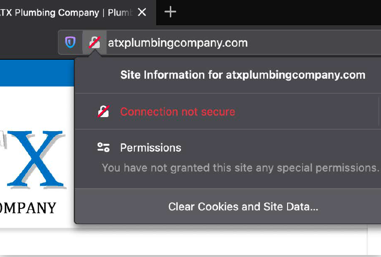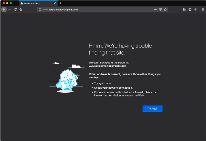 If you enter “www.atxplumbingcompany.com” it should spit you back out at just at “atxplumbingcompany.com” or vice versa, whatever the version you want to use is. You’ll see in the image below, ATX’s site breaking when I try to use www as a sub domain, which is probably the worst case scenario. They need a redirect for this.