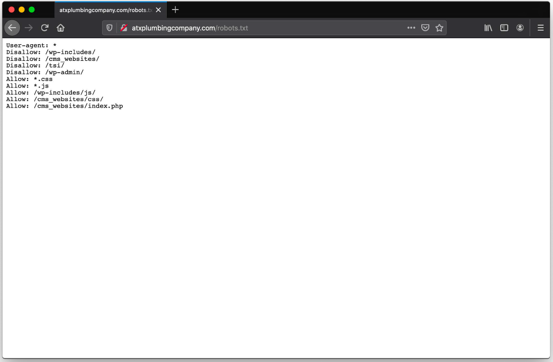 Do a Google search for site: yourdomain.com. In this case, we’re searching for site:atxplumbingcompany.com. This will show you all the pages Google has indexed for that domain. You want to make sure that all the important pages are there. If the pages are there, then nothing is overtly blocking them. If they aren’t there, check the site’s robots.txt (yourdomain.com/robots.txt). Note: If there isn’t a robots, then it’s not the culprit, though it’s a good idea to create one (most CMS generate one).