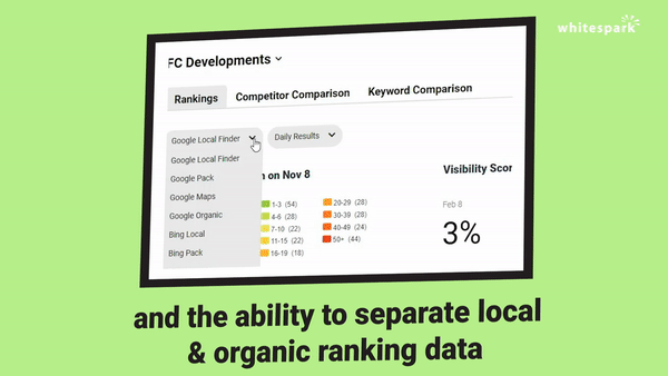 Another frustration with other rank trackers is that they lump organic and local rankings together. They built their rank tracker on organic results and just threw a bone to local by showing you a tiny map pin in the data when you’re also ranking in local. The organic and local algorithms are different, and Whitespark specifically and deliberately separates out organic and local results so you can see your search performance on each independently. You get to see how you’re doing in local without having to painfully extract it from your organic ranking data.