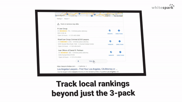 So many rank trackers claim to track local, but their version of local rank tracking stops at the 3-pack. Local is much more than just the top 3 positions, so Whitespark gives you full insight into the top 100 positions in local search. Now you’ll really know where you stand in the local rankings.