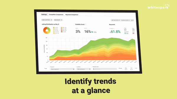 You might generally know where you rank, but you don’t have a clear understanding of your overall visibility across local search. Whitespark breaks down your ranking distribution and calculates your true visibility with a weighted visibility score based on ranking position. You’ll finally see the whole forest instead of just a few trees.