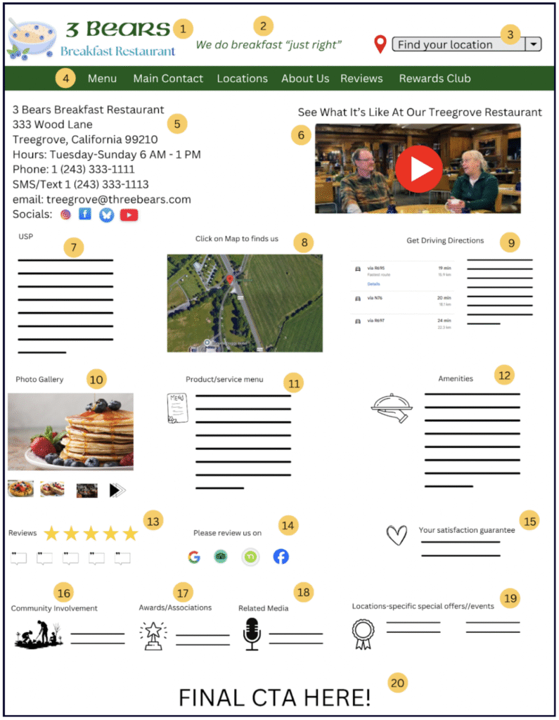 Many local business owners aren’t sure what to publish on their location landing pages, and worry that there isn’t really enough to say about each unique branch of their brand to fuel the development of truly useful content. As you’ll quickly see from this mockup and key, there is almost no end to your options.
