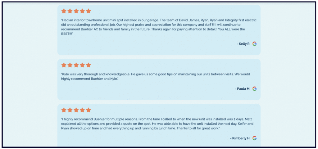 This section offers one of the best opportunities for differentiating your landing pages from one another. You can embed third-party reviews as well as publishing first-party reviews and testimonials you have collected directly from your own customers for the location. Be sure you are not cherry-picking third-party review content to show only positive sentiment, as this is a dishonest business practice. Don’t overlook the value of showcasing photos or scans of hand-written customer testimonials. They have the ring of authenticity and can help potential customers trust that your business will take good care of them.