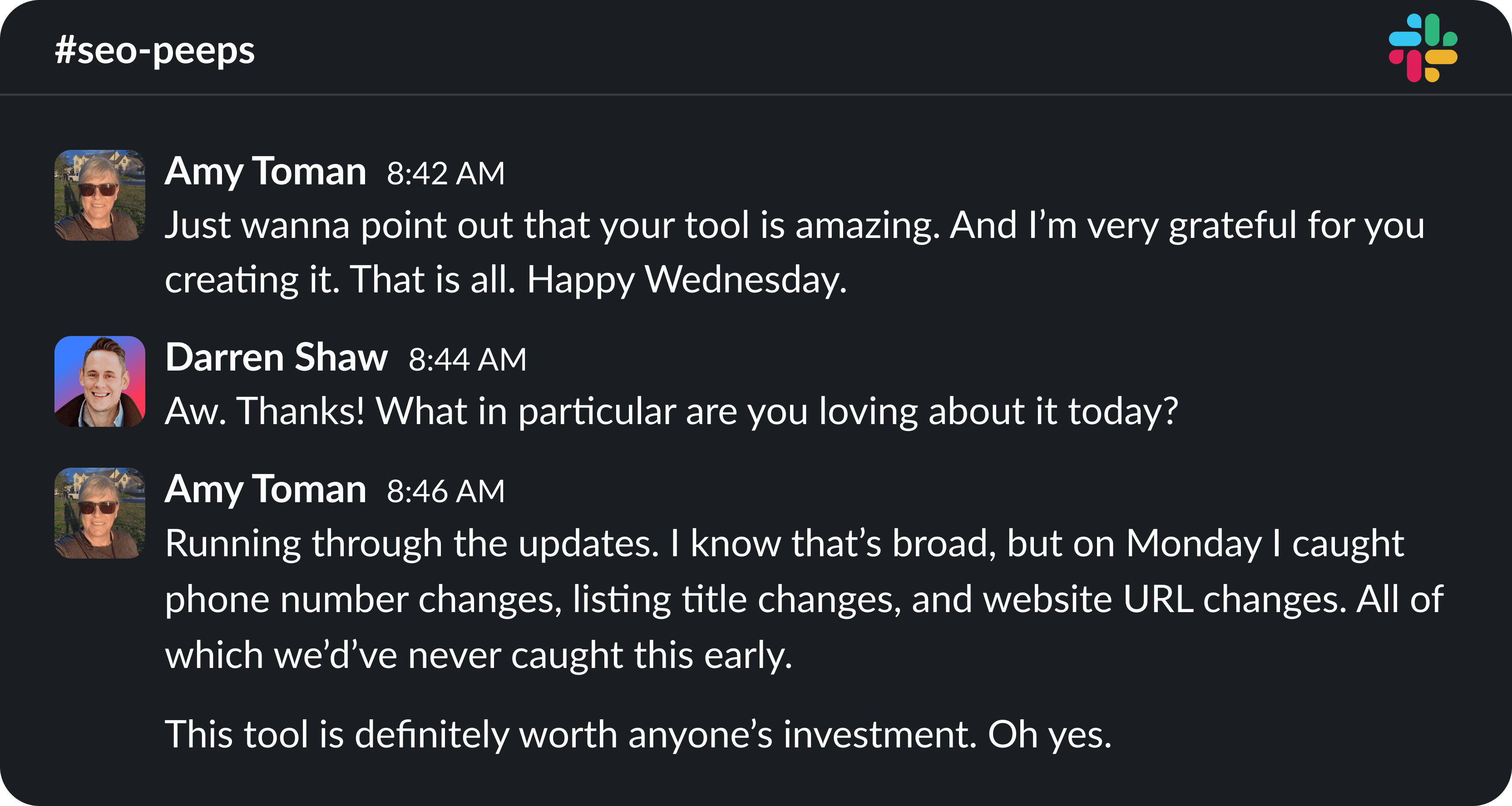 From the moment you import your location to the Local Platform, we'll keep track of all the changes made to your Google Business Profiles — whether they're made by you, Google, or that lemon head, Toby from HR.