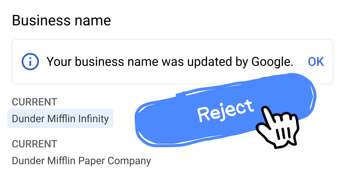 When you reject an update, we push the existing value from Local Platform back to Google, thus overwriting the change Google made, saving you tons of time while also avoiding a potential ranking disaster.