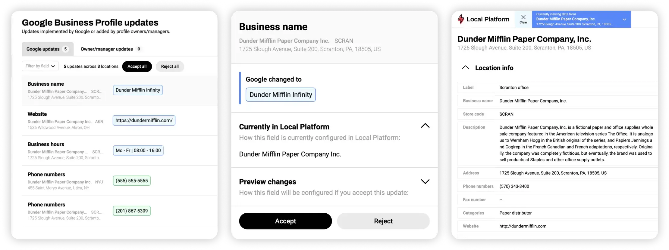 It can be challenging to keep on top of all these updates, and the workflow for accepting/rejecting them within Google's interface is slow and tedious. These annoyances compound when you manage multiple Business Profiles.