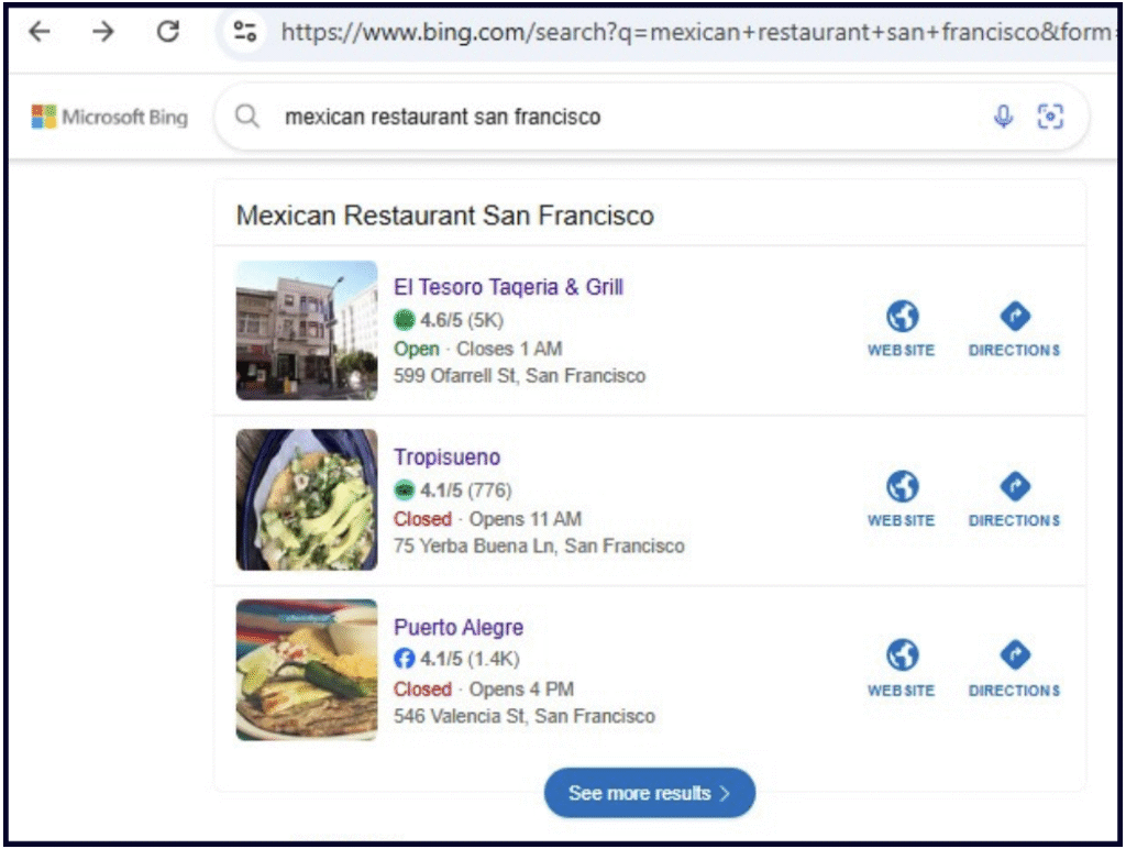 Itâs enough like a Google Business Profile to feel fairly comfortable, but with some interesting differences weâll be diving into. Bing Places listings are featured in Bingâs version of local packs, which show up in their organic search engine results pages (SERPs) in the bing.com/search environment: