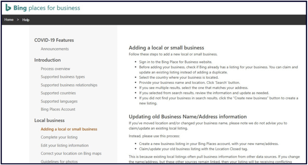 Unlike Googleâs famous âGuidelines for representing your business on Googleâ which is the single-source doc of all things GBP, information about how to create and maintain your Bing Places listing is located in Bing Places for Business Help (shown above). There is a left-hand navigation menu of various topics, like âsupported business typesâ and âedit your listing information.â The main quality guidelines are located under the heading âData Quality Guidelinesâ and explain how Bing wants you to fill out the various fields of your listings (like name, categories, etc.). Failure to follow Bingâs guidelines can lead to listing suspension, as they state: