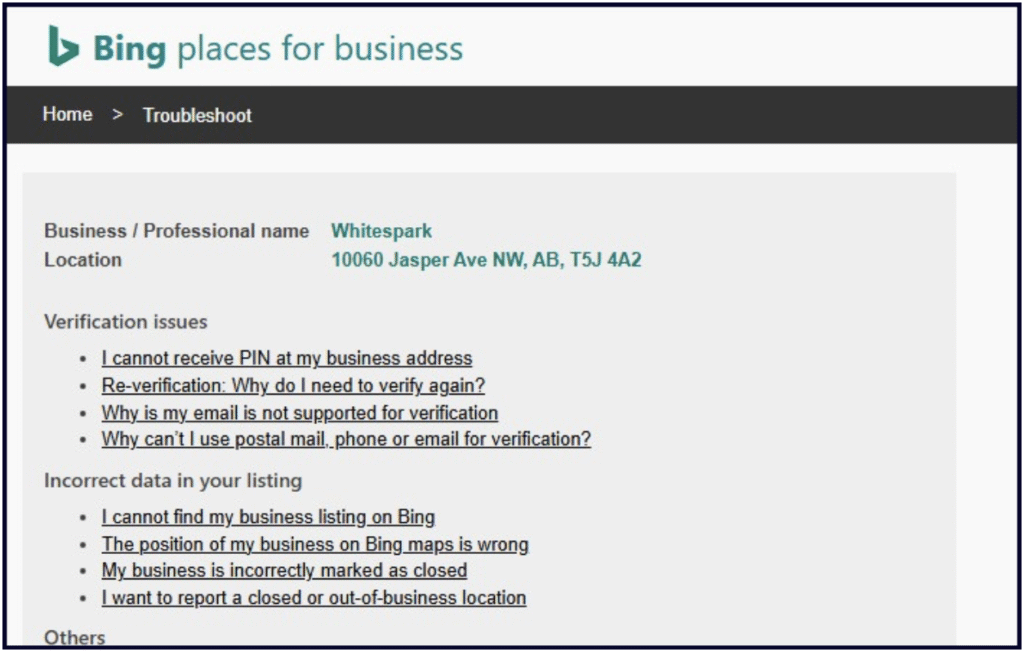 When logged into your Bing account, you can access this master Troubleshooting doc, which consists of links to solving common issues like verification problems or incorrect data. It also includes the link to the Bing Places Contact Support Form.