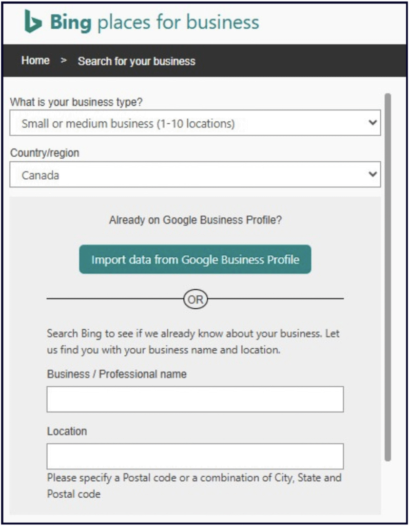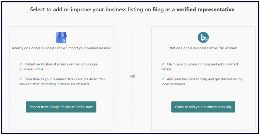 At this point, youâll be given two options for creating a new listing. You can either build it in-house in Bingâs dashboard, or you can import information from a pre-existing Google Business Profile: