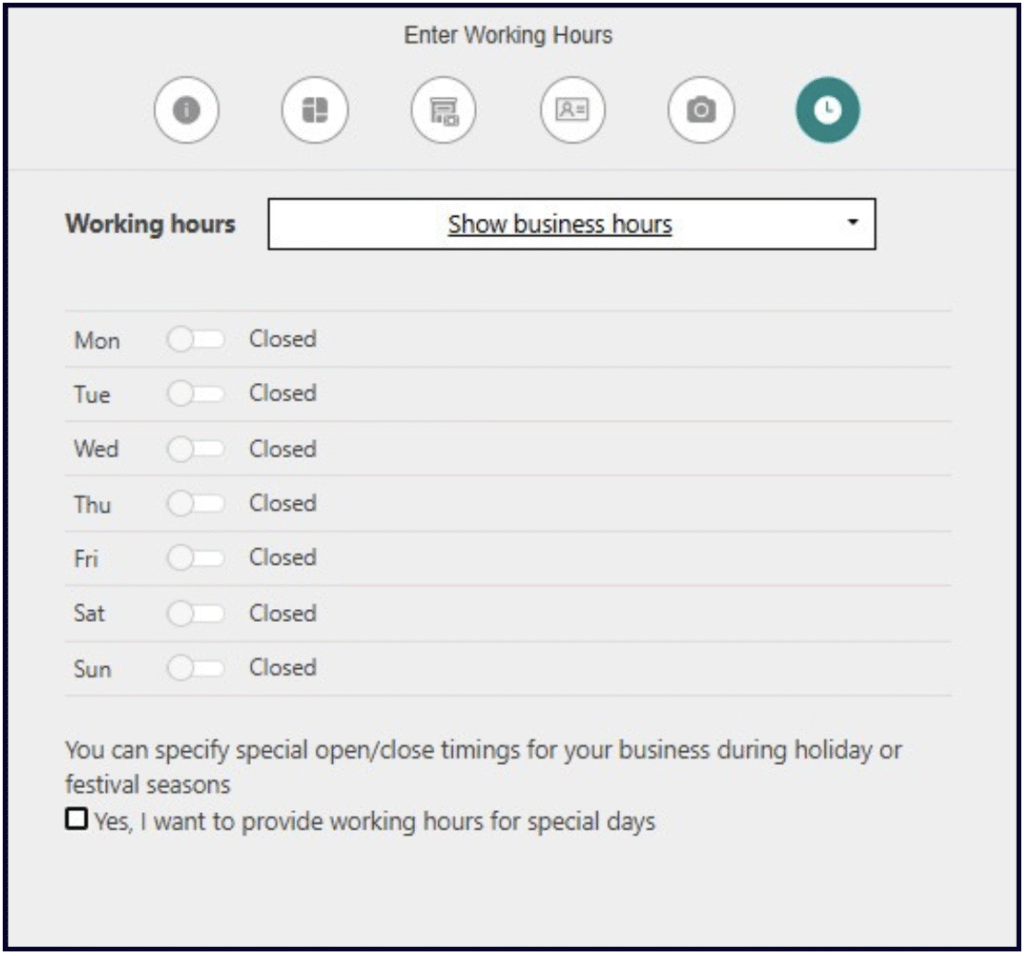 You can also click the âYes, I want to provide working hours for special daysâ checkbox to add your open hours for specific days of the year, such as holidays.