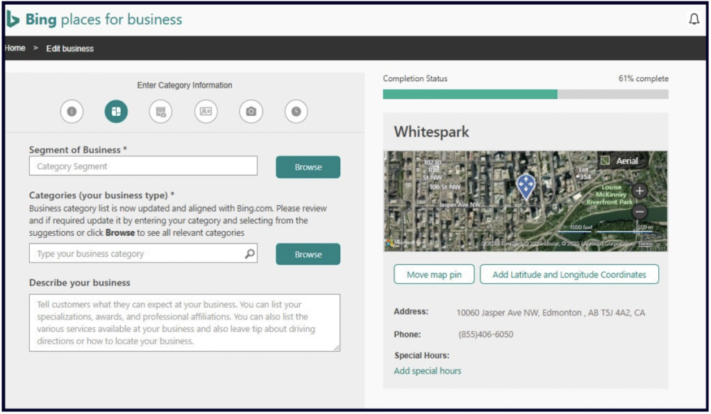 You can add up to ten categories to describe your business. Begin by selecting your âsegment of businessâ â think of this as your industry â then add as many categories as are relevant, and finally, specify your primary category from the available options. Our impression is that Bing Places’ system of categorization is not as sophisticated as Googleâs, and you may have to do some extra digging to find a category that works for you. Bing states: