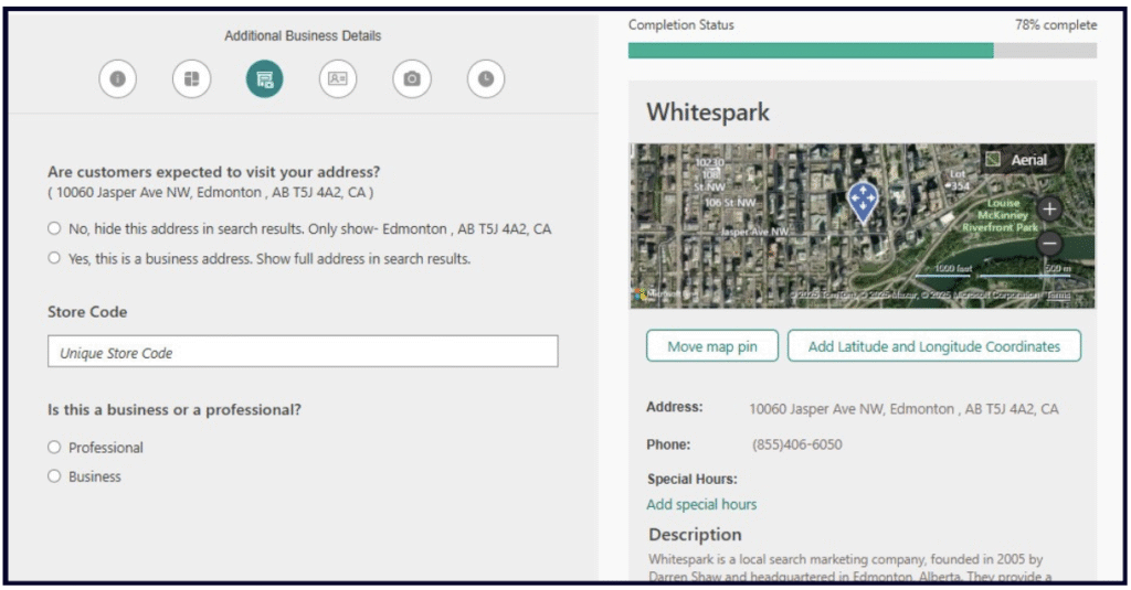 This is an important part of creating your Bing Places listing, as it includes radio buttons for whether you want your address to be visible or hidden (as described above in our section on addresses). With the click of a button, you can make this choice.