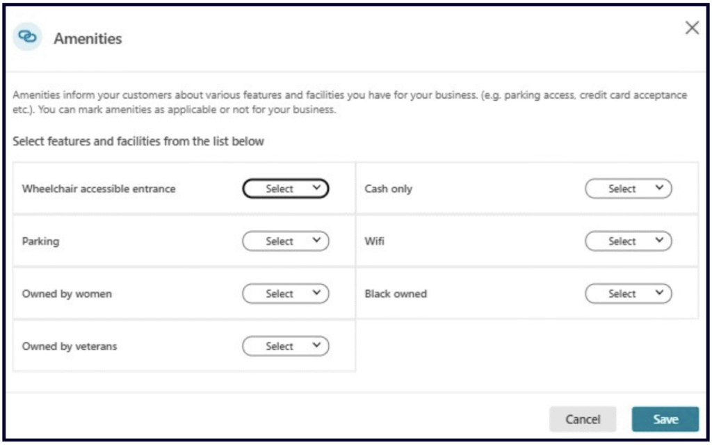The âAmenitiesâ section is fairly limited, but you can take the time to select any qualifiers (such as âWheelchair accessible entranceâ or âOwned by womenâ) that apply to your business.