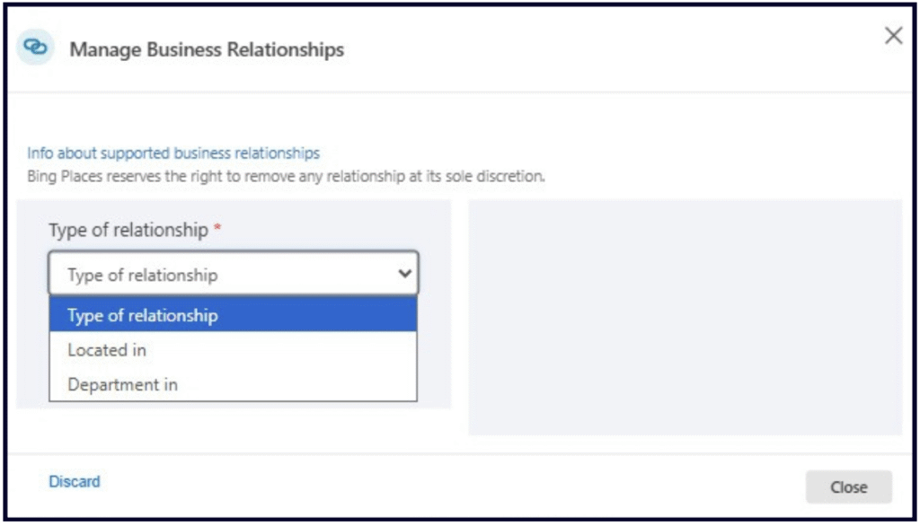 The âBusiness Relationshipsâ section is what youâll need to turn to if your listing represents a department within a business (like the sales department of a car dealership) or has its premises inside a larger container entity like a mall or park.