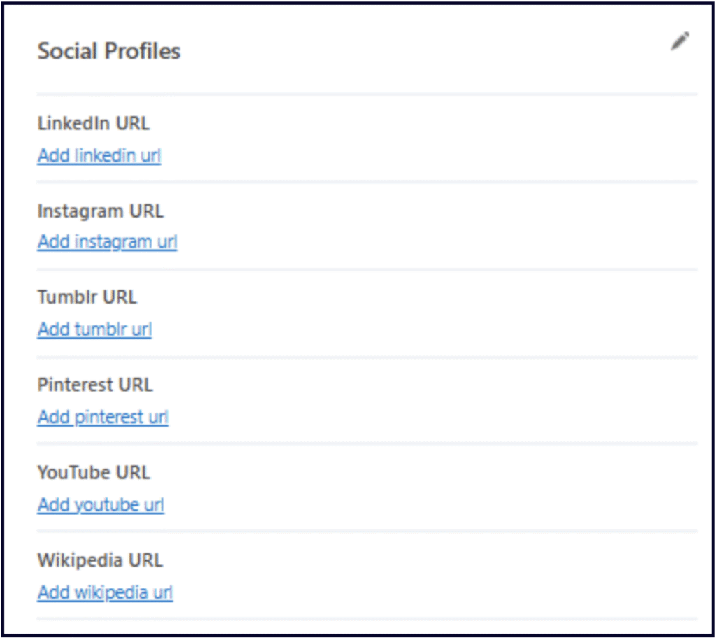 And finally, this is the social section that is a big improvement on the one you encountered when entering your basic business information. Here, you can add the URLs of your profiles on Linkedin, Instagram, Tumblr, Pinterest, YouTube, and even your Wikipedia listing (if you have one).