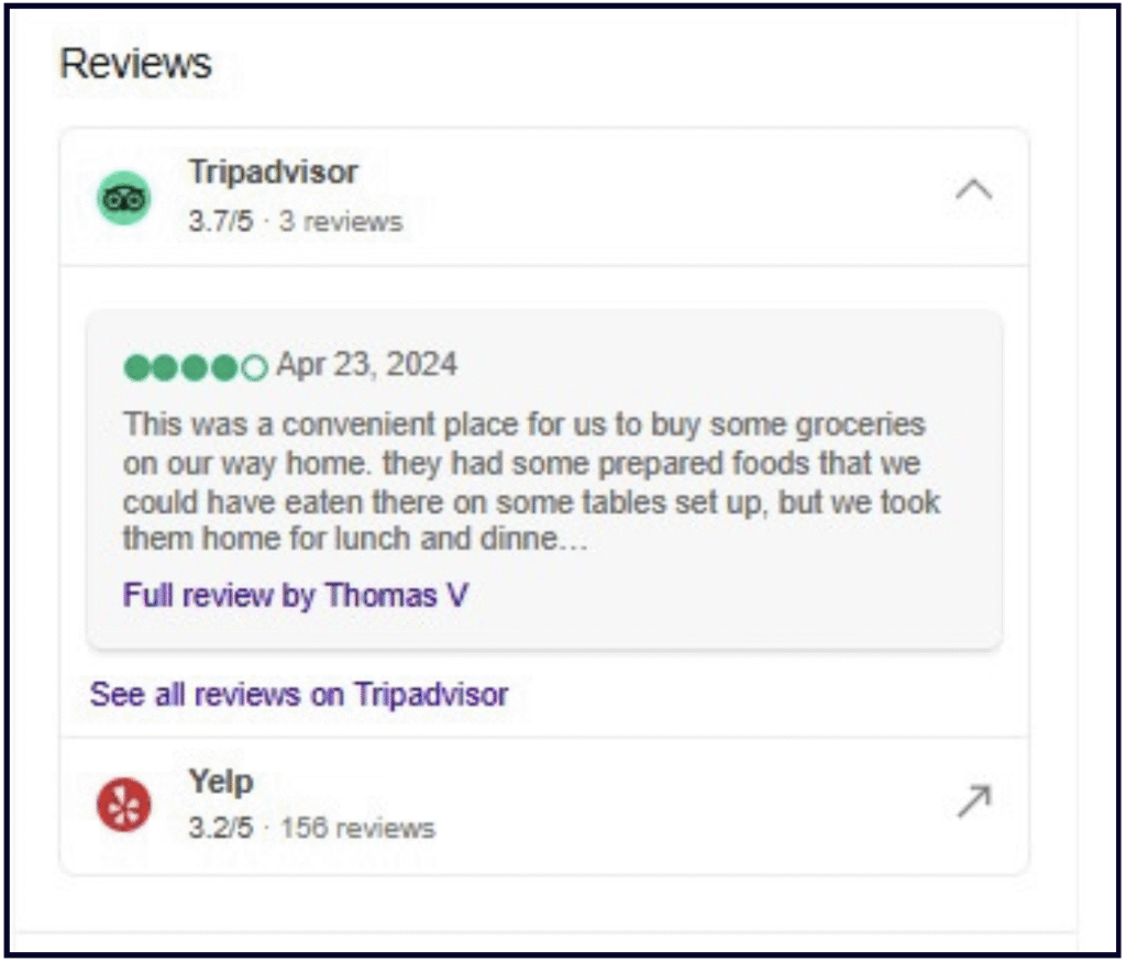 Your Bing Places listing will show reviews for third-party sites like TripAdvisor, Yelp, ThreeBestRated, and Facebook. Instead of controlling these from your dashboard, youâll need to work on earning and responding to third-party reviews on third-party platforms.