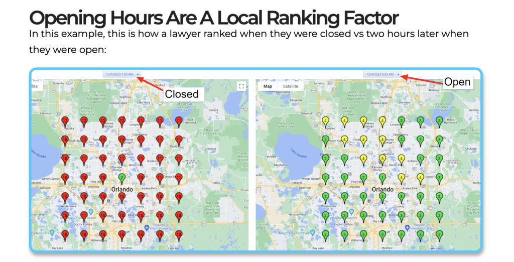 It’s probably not new news to you if you read this study from Sterling Sky in 2023 documenting dramatic ranking shifts correlating with whether a business is open or closed at the time of search. In fact, we’ve learned that rankings begin to degrade in the final hour that a business is open each day.Â