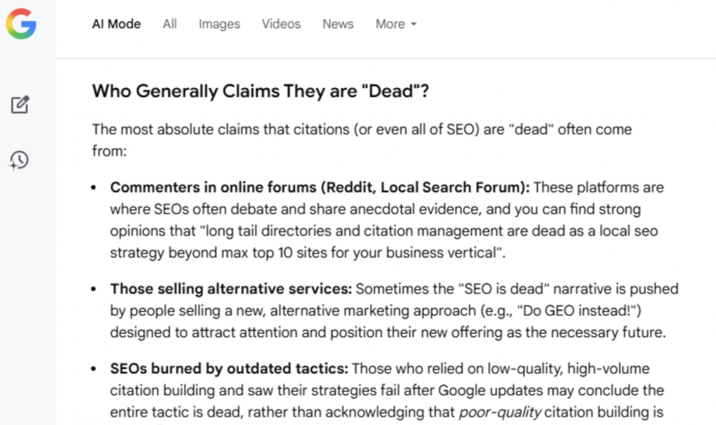 That last bullet point accords very well with Whitespark’s Local Search Ranking Factors survey respondents citing recency of reviews as the 11th-most influential local pack/Maps ranking factor. Review signals also repeatedly feature as influential on AI search visibility, as well as impacting Google Local Service Ads rankings.Â
