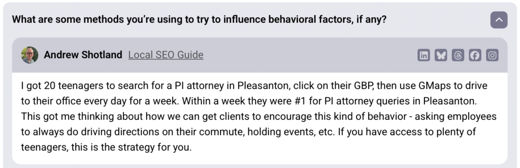 Newcomers to local search may think of it as a relatively level playing field, but I urge you not to fall into this rut because the expert commentary section of the new Whitespark survey reveals just how experimental your most-motivated local competition may be when it comes to influencing Google’s concept of behavioral signals. Check these out: