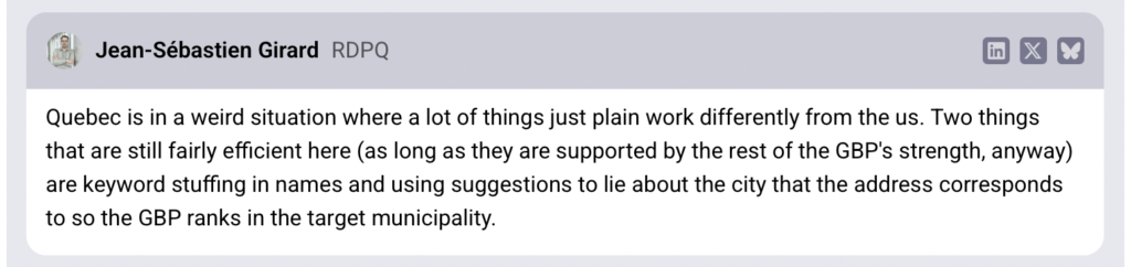 Color me unsurprised that your competitors are stuffing their business titles and lying to Google in a variety of ways – and not just in Quebec.Â