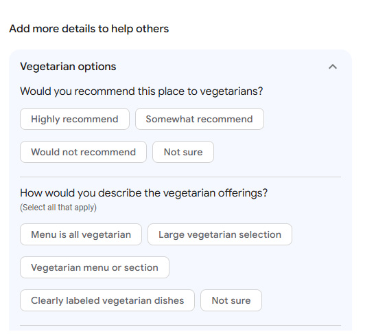 Reviews that contain structured attribute validation based on questions Google asks reviewers. Hat tip to Claudia Tomina for capturing an apparent expansion of Google’s quest to get more information about specific aspects of local businesses by having them select from large sets of pre-populated attributes when leaving a review. Lots of questions need to be answered about where Google is getting the wording of these labels from and how they might impact your ability to rank for tons of terms that might not even be on your website. Stay tuned, because Whitespark has a major study forthcoming on this fascinating topic!