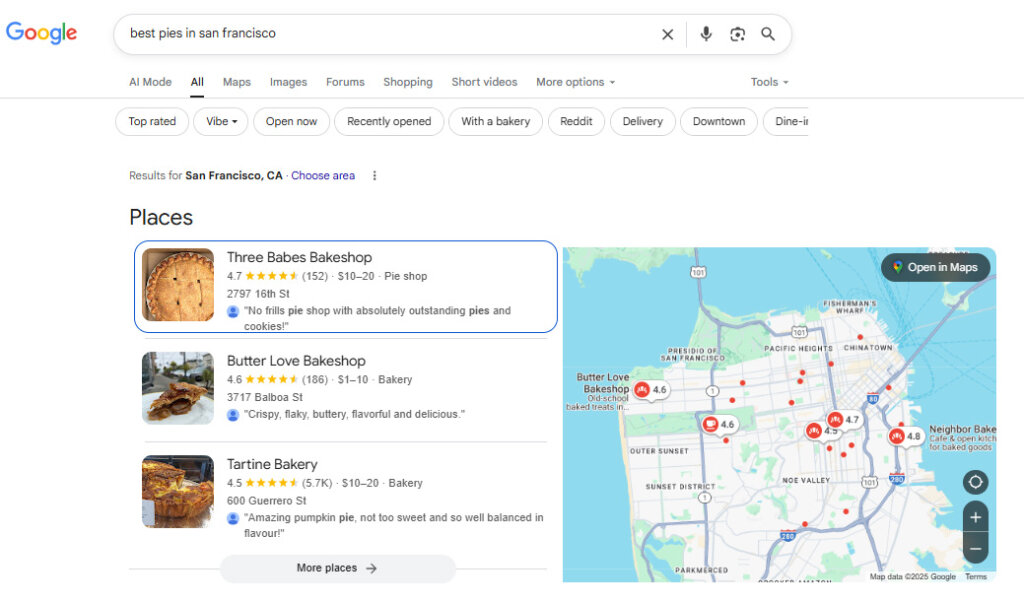 In Google Local Packs and Maps, reviews that include specific language about products, services, amenities, and features of the business can be excerpted in Google local packs as “local justifications”. See the above examples of customers mentioning pies in their reviews. Despite the fact that none of the businesses in this set has the word “pies” in their business name, these justifications confirm to potential customers that these bakeries offer this menu item.Â